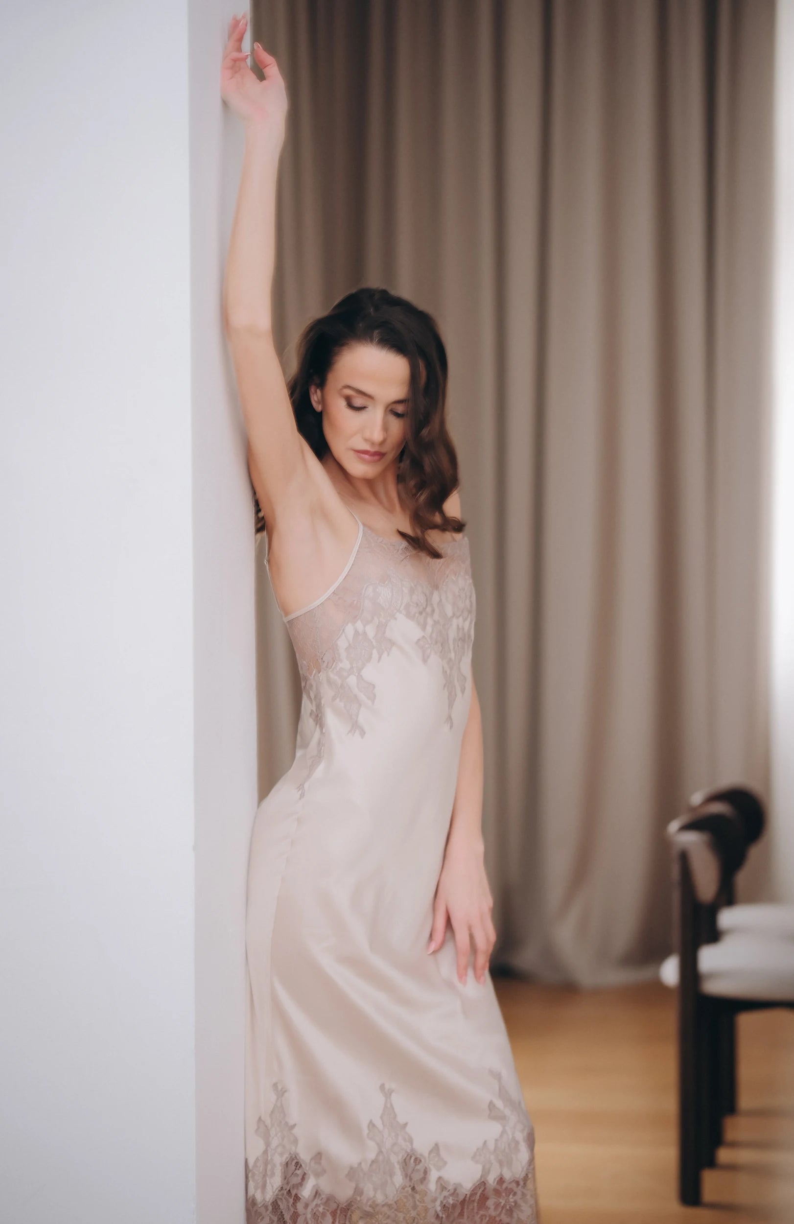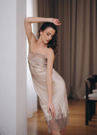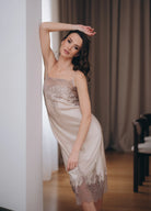 Фина сатенена материя с мек блясък, която се плъзга по тялото, допълнена от изящна френска дантела в топъл шампански нюанс. Кройката е издължена, балансирана и изключително женствена – подчертава формите, без да ги натрапва.