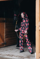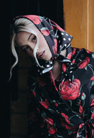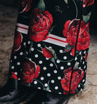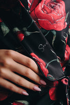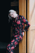 Костюм от марокански сатен с елегантна леко свободна кройка в ръчно рисуван принт на червени рози върху черен фон. Има акцент от розови елементи и точки на края на крачолите и от вътрешната част на маншета. Сакото е изключително женствено с голяма яка, ръкави с подвиващ се маншет и предно завръзване с дебело коланче тип панделка. Панталонът е с ластик в кръста  и с широки крачоли. Целият костюм е обкантен с фин сатенен паспел в черен цвят .