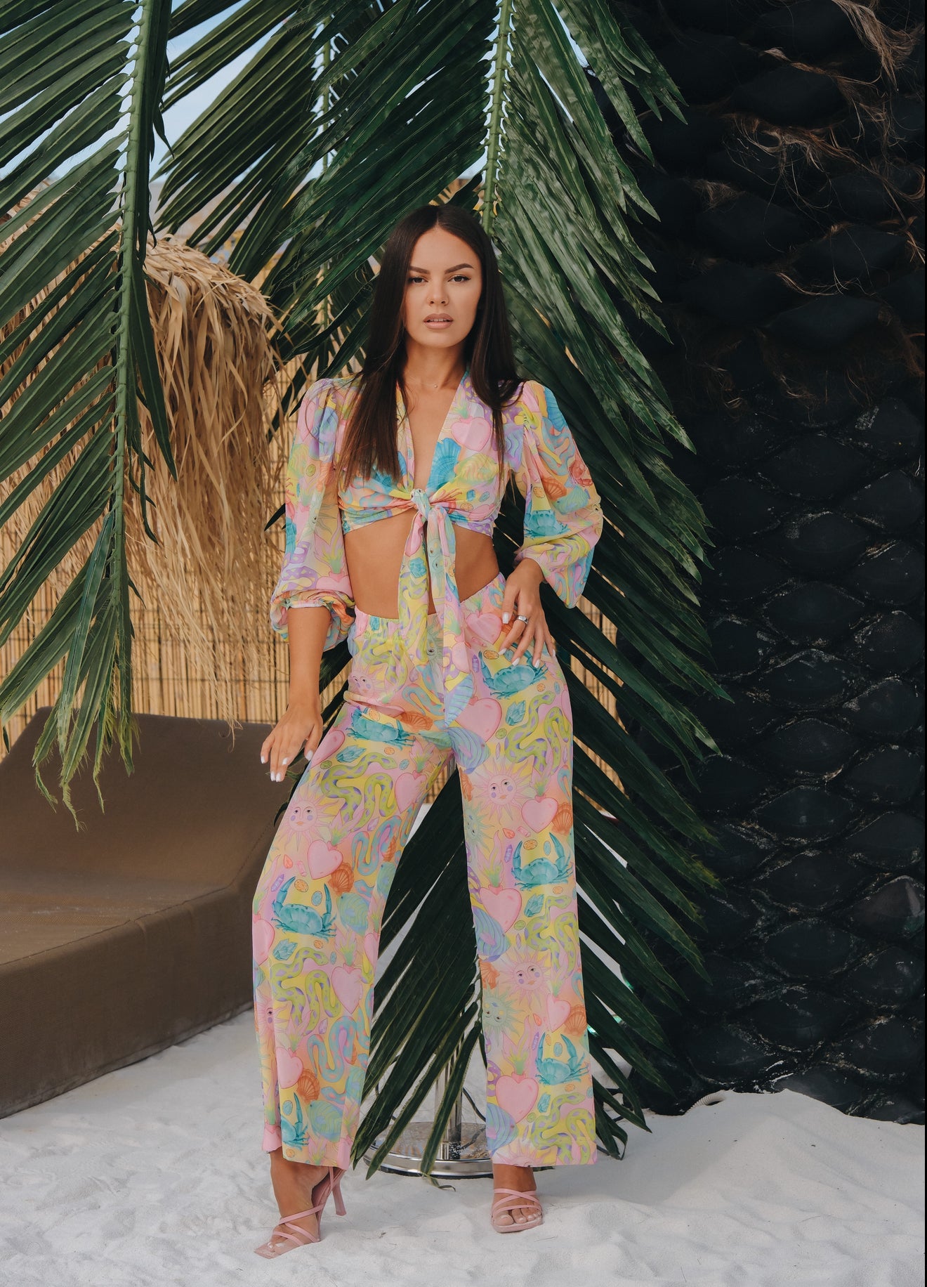 Летен сет от две части, изработен от лека и ефирна материя с цветен, артистичен принт, специално нарисуван за колекцията. Горната част е с дълъг ръкав и се връзва отпред, което позволява персонализирано прилягане и акцентира върху талията. Панталонът е с висока талия и свободна кройка, осигуряваща комфорт и свобода на движение. Идеален избор за плажни разходки, парти на яхта или стилна вечер край морето.