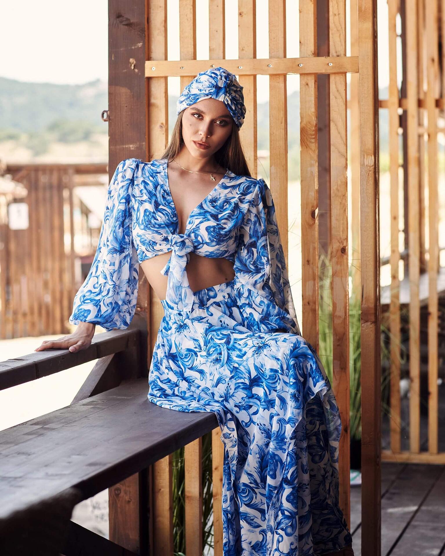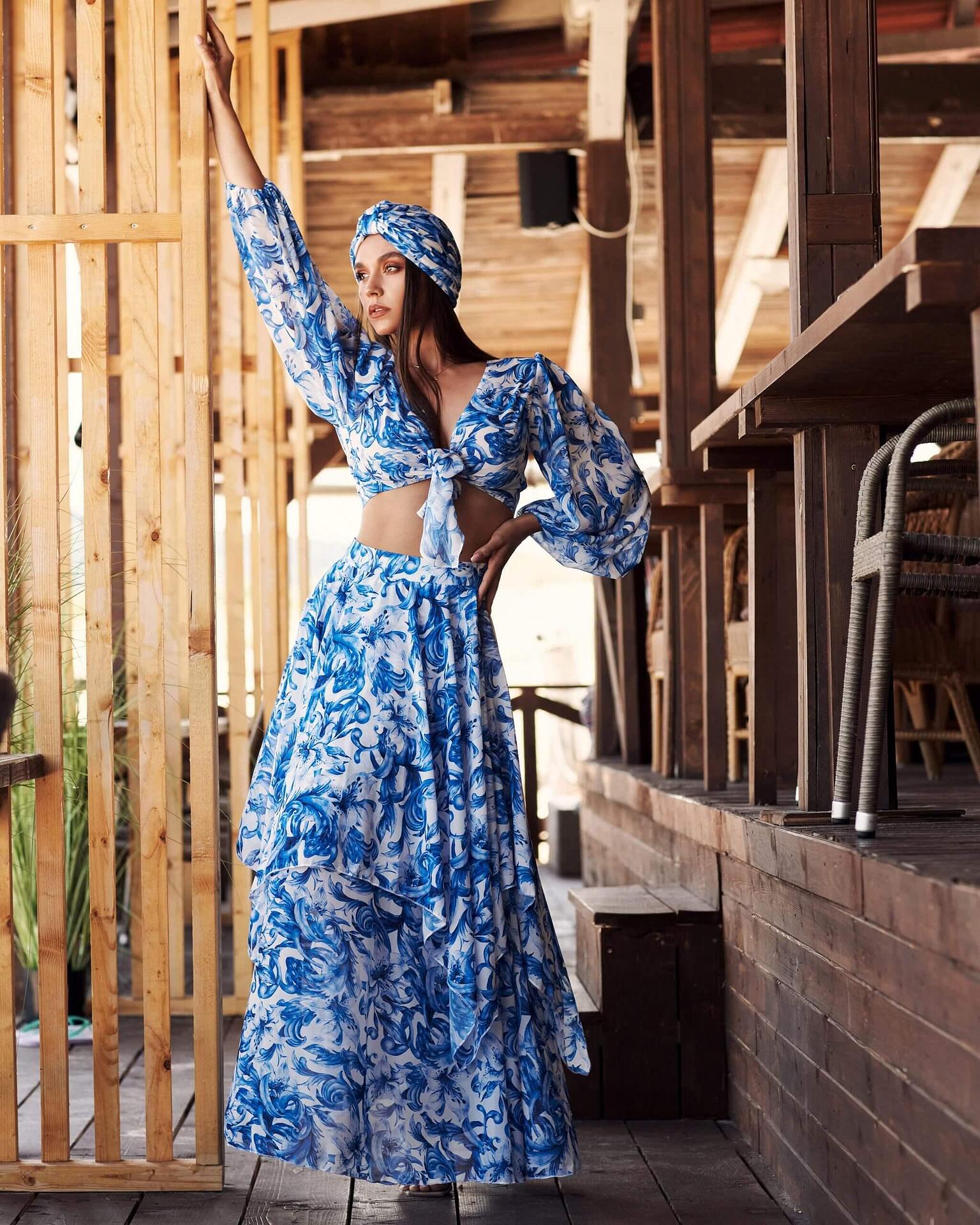 Нашият Royal Blue Lilies сет включва дълга феерична пола от шифон и къса блуза с ефирни дълги ръкави Има предно завръзване, за най- голямо удобство на клиента спрямо мерките на всеки.