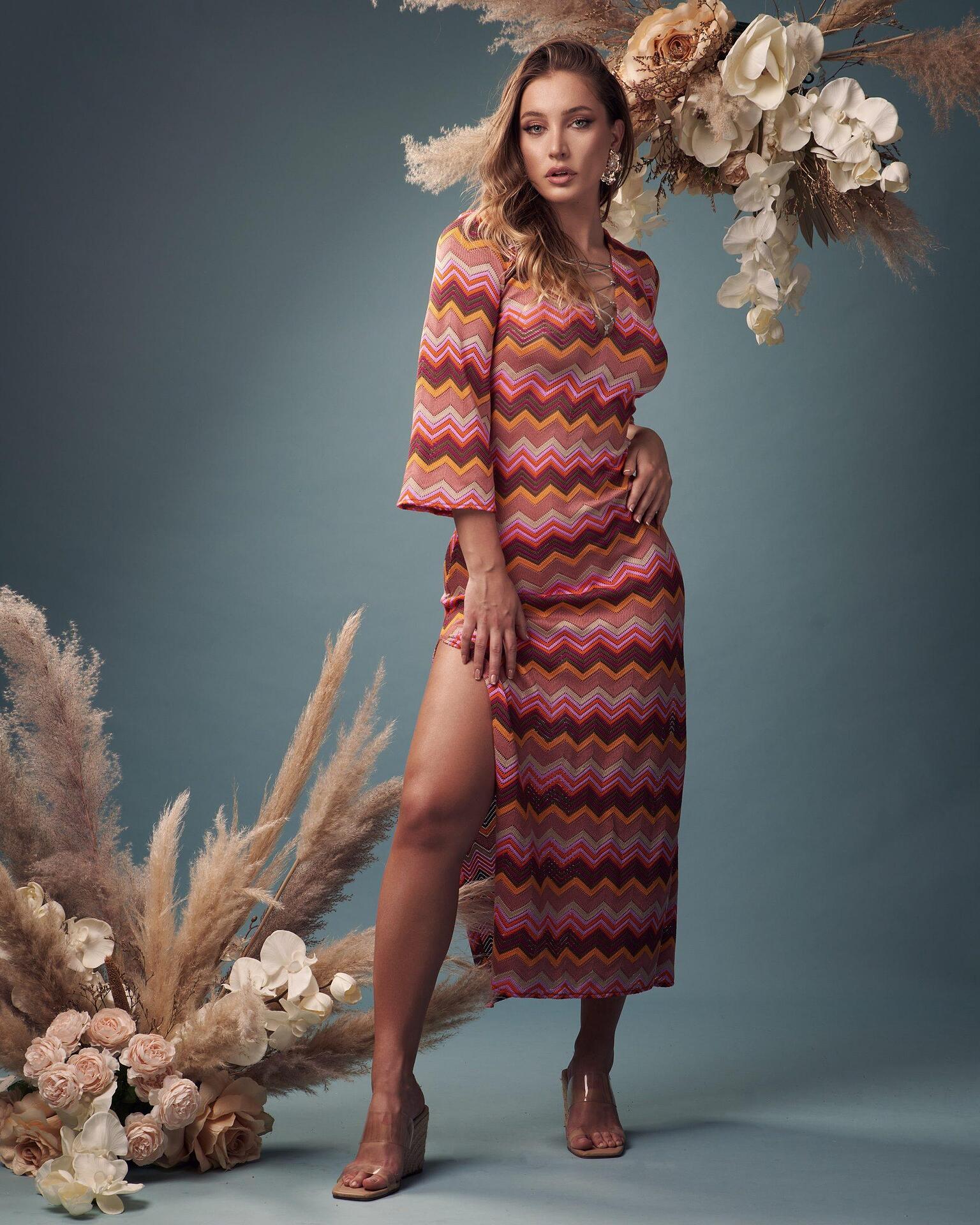 Дълга модерна рокля , изработена от фино плетиво зиг заг , с дълбоко триъгълно деколте с връзки, дълги широки ръкави и странични цепки. С тази рокля комбинираме оригиналност и изисканост, белязана от комфорт и женственост.