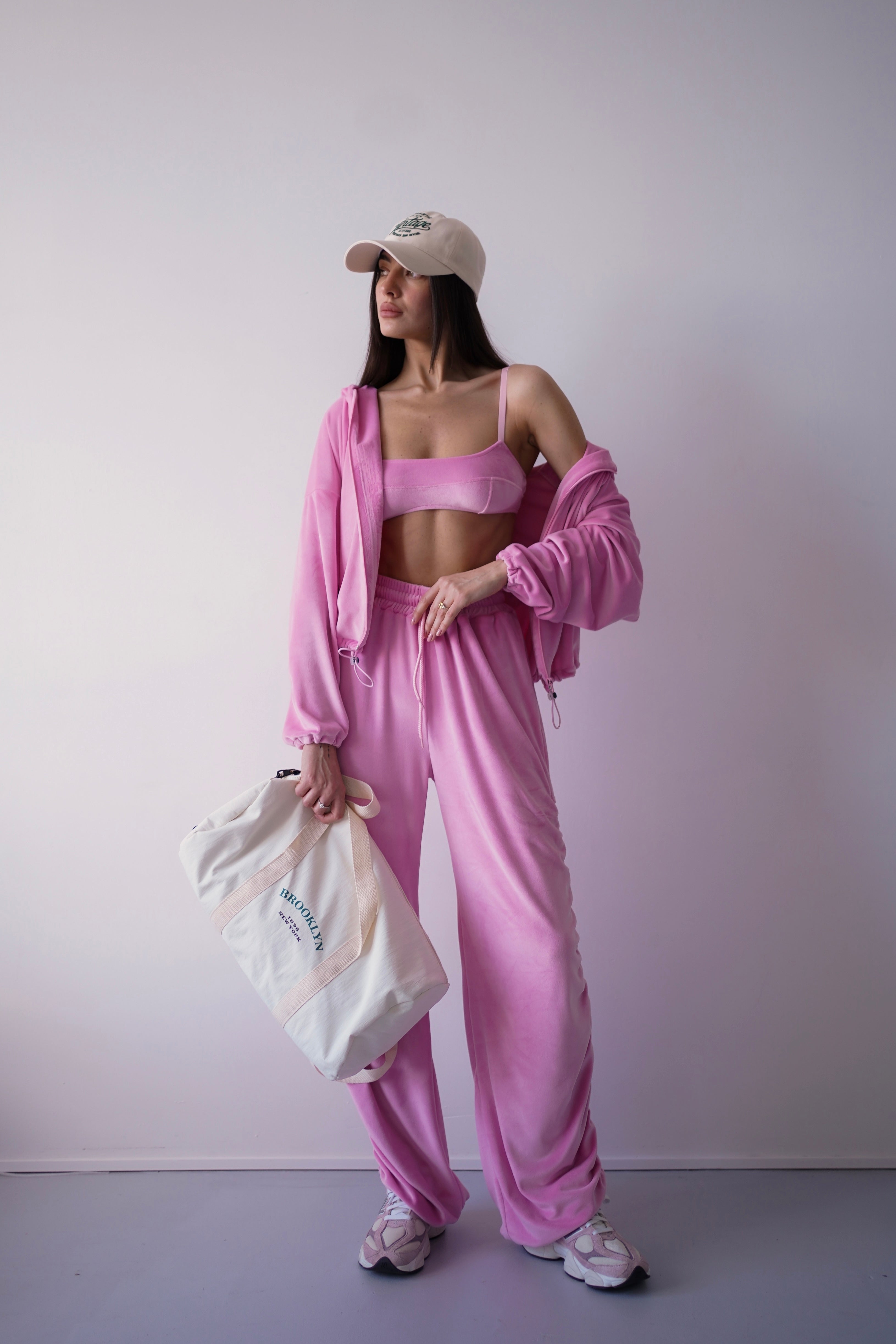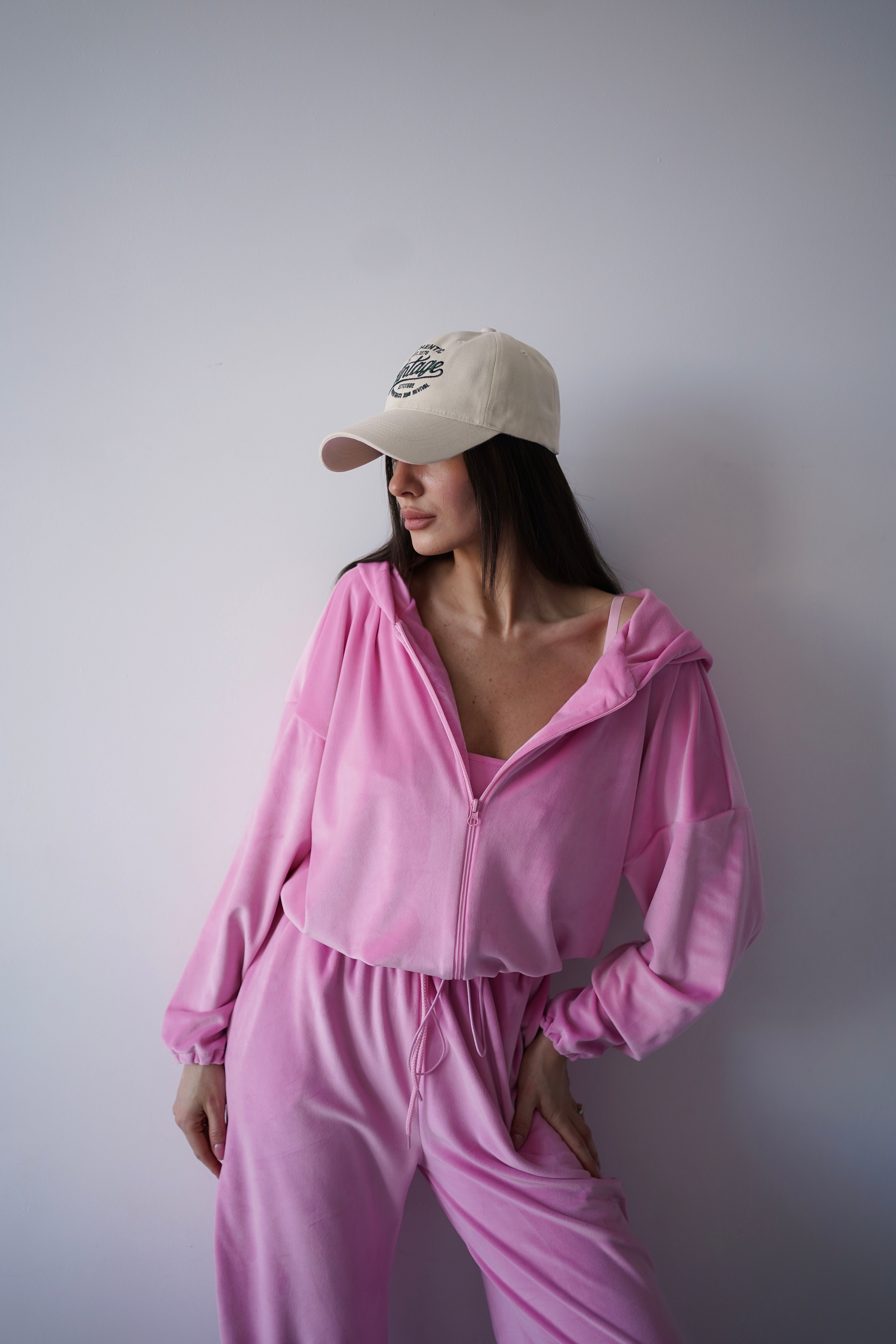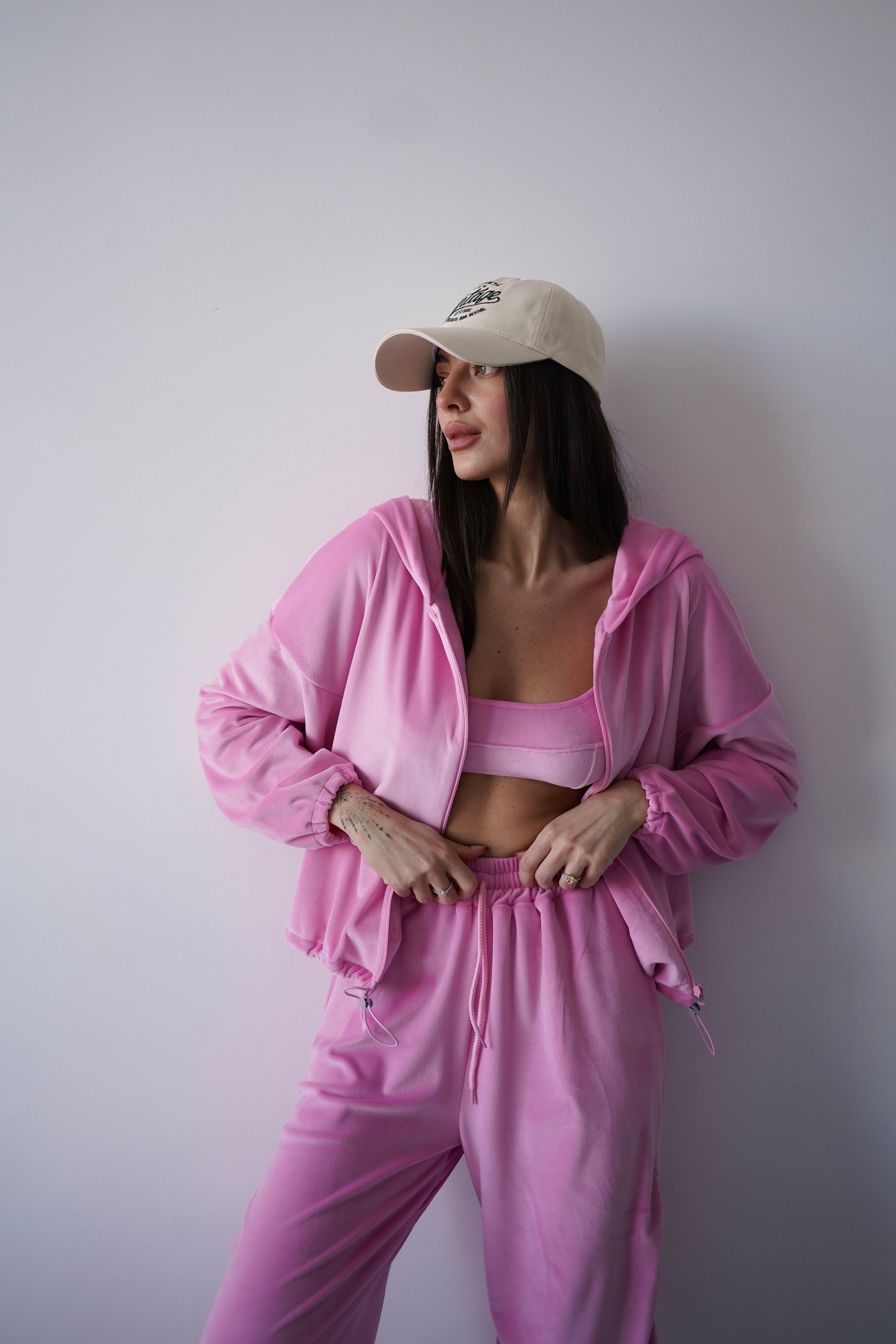 Този комплект е създаден за моменти на пълен комфорт – у дома, на брънч с приятелки или просто когато искате да изглеждате стилно и небрежно. Съдържа топ с регулируеми презрамки, удобен широк панталон с ластик на талията и жакет с дълъг ръкав и цип . Наситеният розов цвят и меката кадифена текстура създават усещане за уют и женственост. Сетът е чудесен за прохладните дни, удобен и приятен за носене.