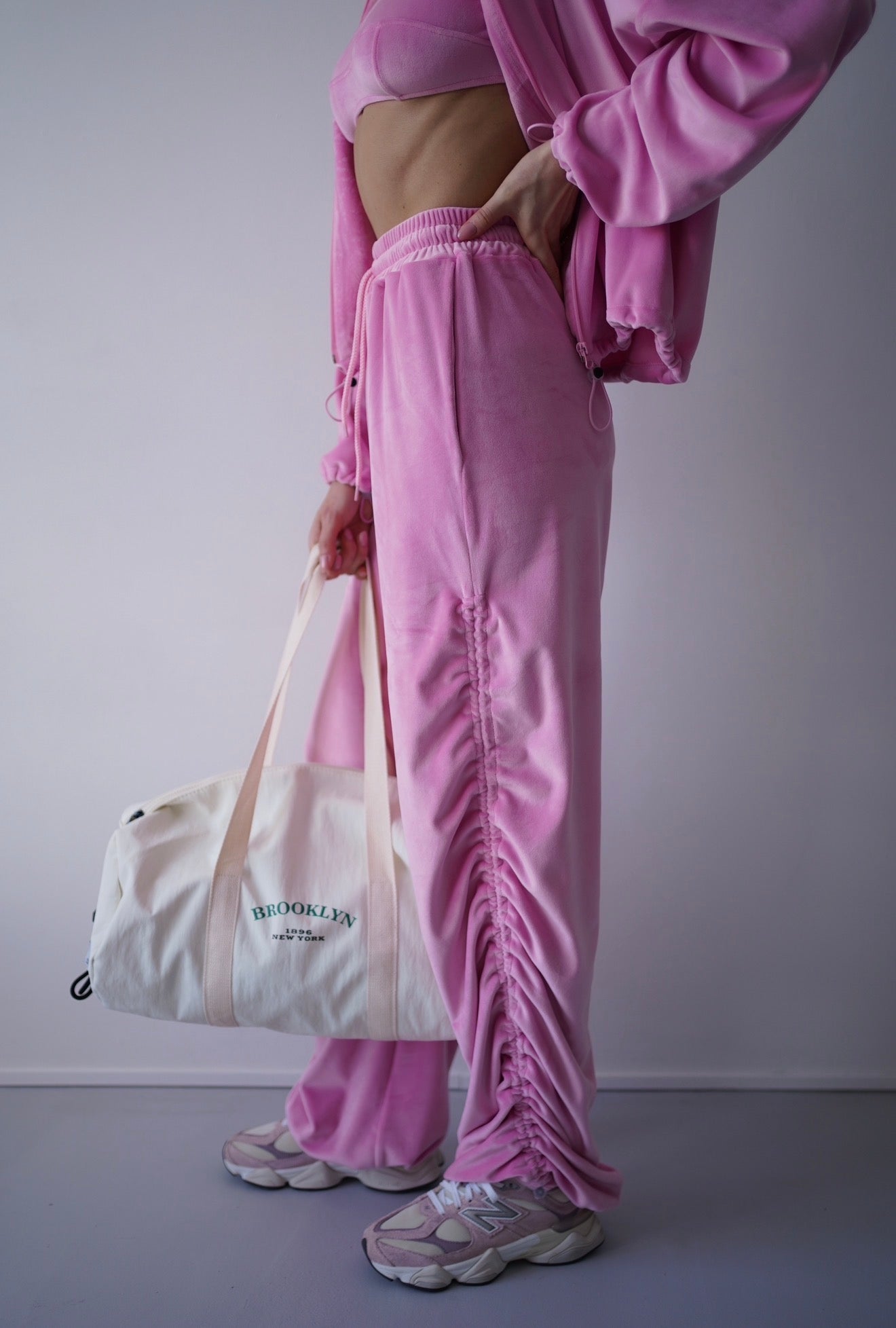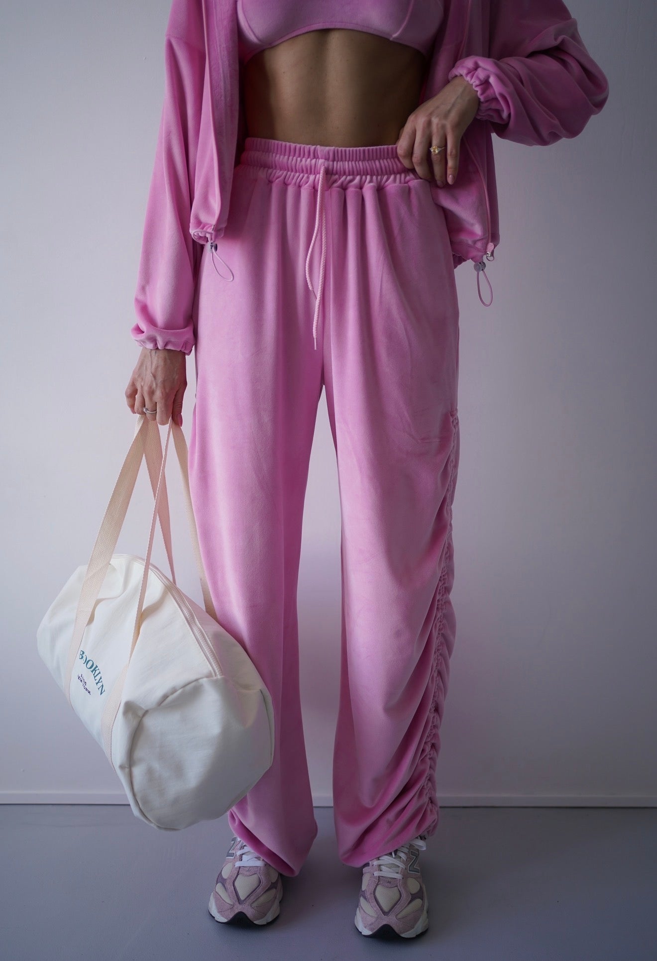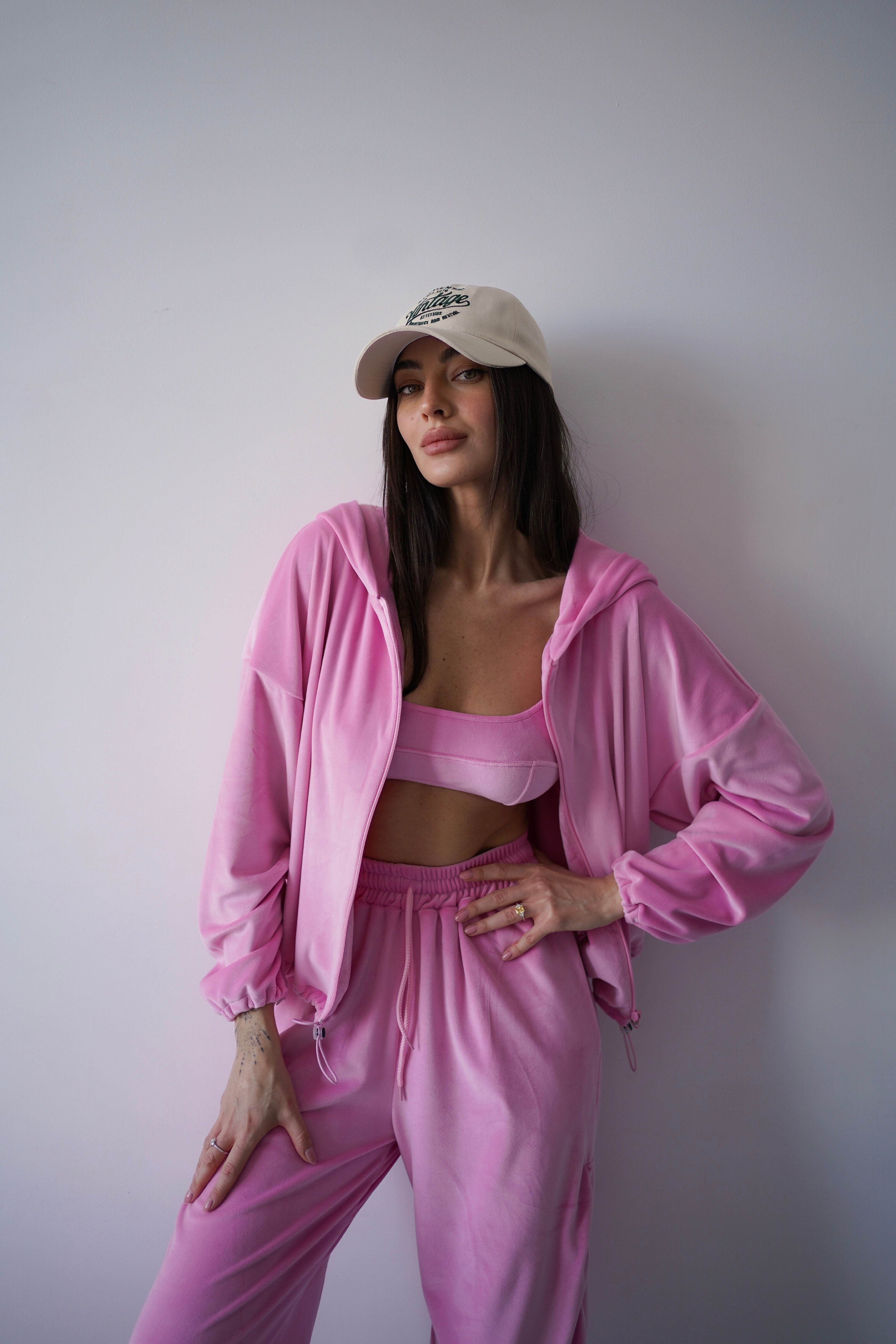 Този комплект е създаден за моменти на пълен комфорт – у дома, на брънч с приятелки или просто когато искате да изглеждате стилно и небрежно. Съдържа топ с регулируеми презрамки, удобен широк панталон с ластик на талията и жакет с дълъг ръкав и цип . Наситеният розов цвят и меката кадифена текстура създават усещане за уют и женственост. Сетът е чудесен за прохладните дни, удобен и приятен за носене.